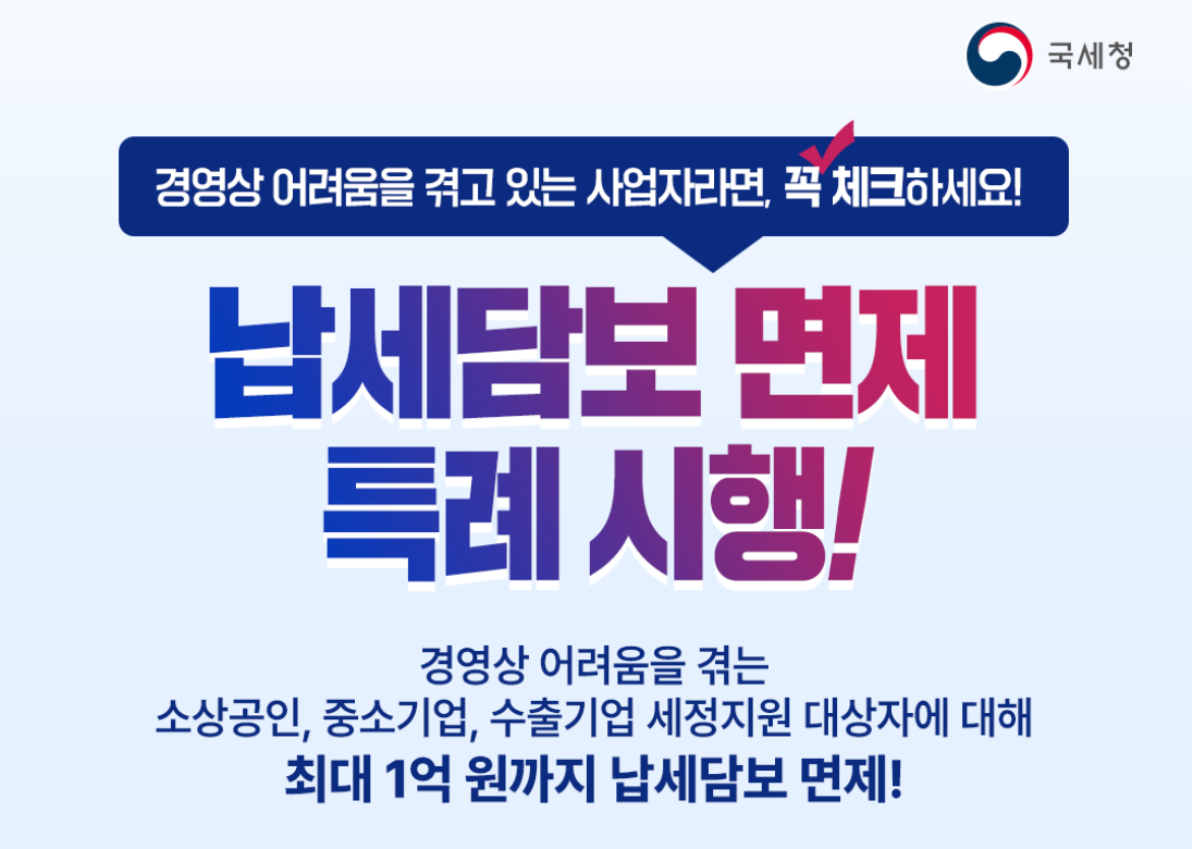 그래서 국세청이 2025년부터 한시적으로 최대 1억 원까지 담보 없이 신청할 수 있도록 ‘납세담보면제특례’를 시행합니다!