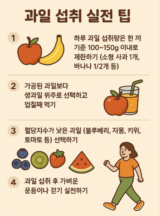 - 과일을 먹은 후에는 가벼운 운동이나 걷기를 실천하고, 다른 끼니에서 당질 섭취를 줄여 혈당 균형을 유지하세요.