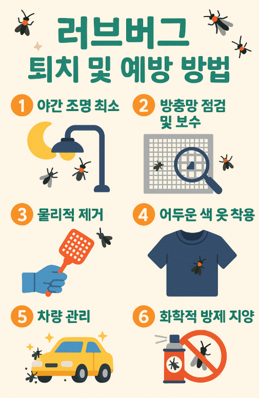 | 야간 조명 최소화 | 러브버그는 빛을 좋아하므로 밤에는 옥외 조명이나 가로등을 줄인다. |
