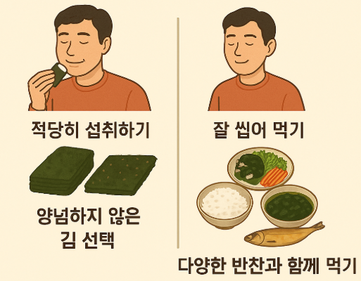 적당량만 먹고, 충분히 씹어 먹으며, 조미김보다는 생김을 선택하는 것이 좋습니다.