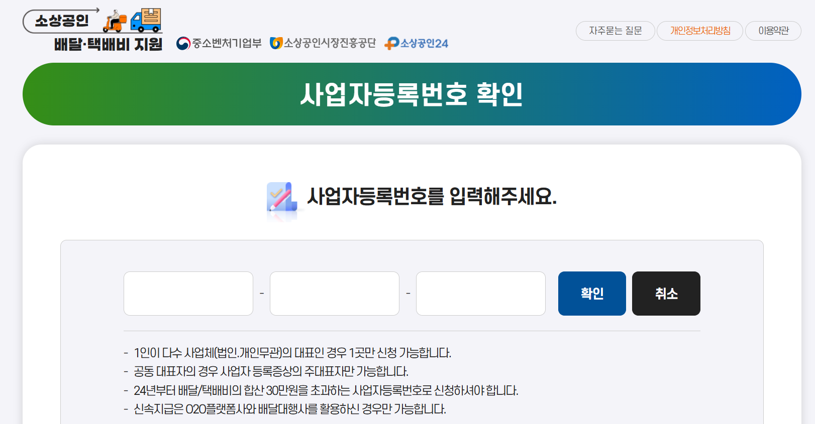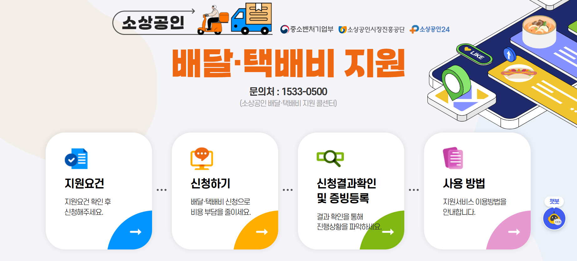 - 홈페이지: 소상공인배달택배비지원.kr (챗봇 24시간 운영, 채팅상담 평일 09:00~18:00)