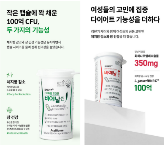 | 주요 기능 | 체지방 감소, 장 건강 | 체지방 감소, 장 건강, 갱년기 건강 |