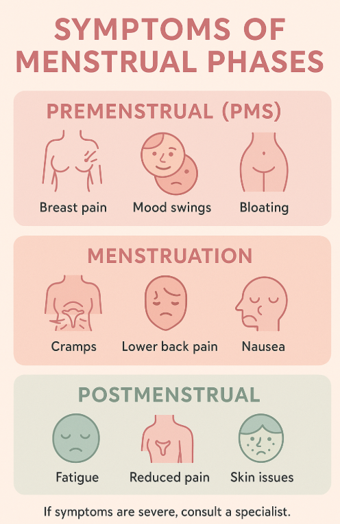 | 생리 중 | 아랫배·허리 통증, 피로, 설사/변비, 두통, 어지럼증 | 무기력, 예민함, 감정 기복 | 진통제 복용, 외출 꺼림, 피부 트러블 심화 |