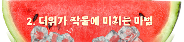 · 수박과 오이 : 더워서 속까지 말라 버려요. 열에 약한 작물은 제대로 열매도 못 맺고, 겨우 살아남아도 맛이 없거나 작게 자라죠.