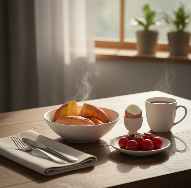 삶은 고구마 한 조각, 여기에 계란까지 곁들이면 완벽한 든든 아침세트!
