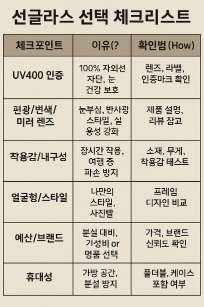 | UV400 인증 | 100% 자외선 차단, 눈 건강 보호 | 렌즈, 라벨, 인증마크 확인 |