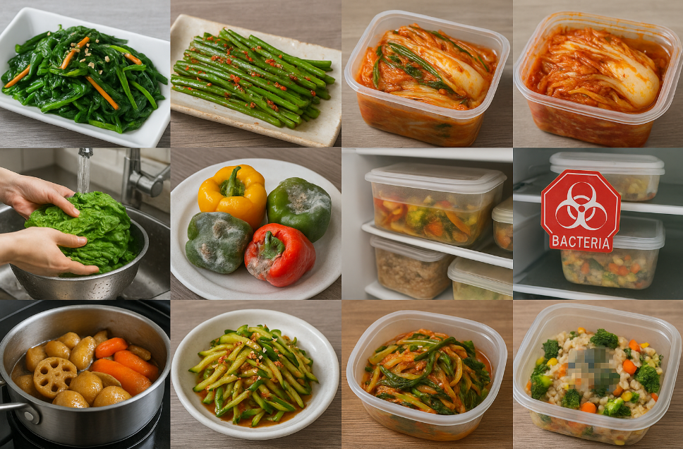 - 채소 반찬(나물, 무침, 샐러드 등) : 채소 반찬은 반드시 깨끗이 씻고, 먹기 직전에 준비해 냉장 보관하며, 남은 것은 다시 먹을 때 충분히 가열하세요.