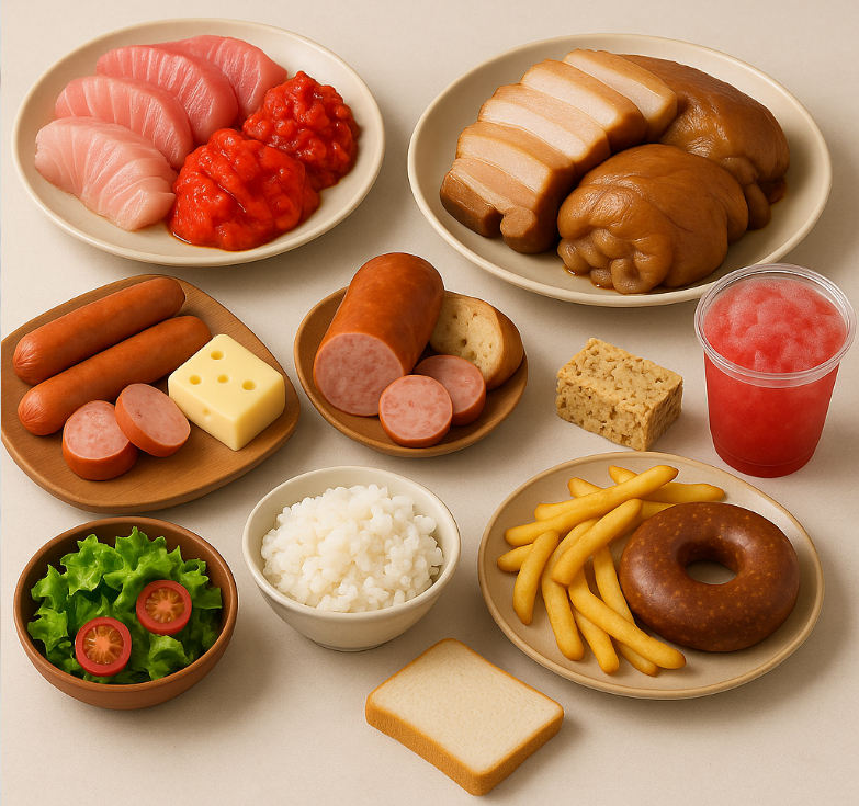 - 가공식품(햄, 소시지, 치즈 등) : 가공육은 질산염·아질산염 등 방부제와 포화지방, 트랜스지방이 많아 심장병, 뇌졸중, 암, 치매 위험까지 높입니다. 장마철에는 오염과 세균 번식 위험이 더 크니 유통기한을 잘 확인하세요.