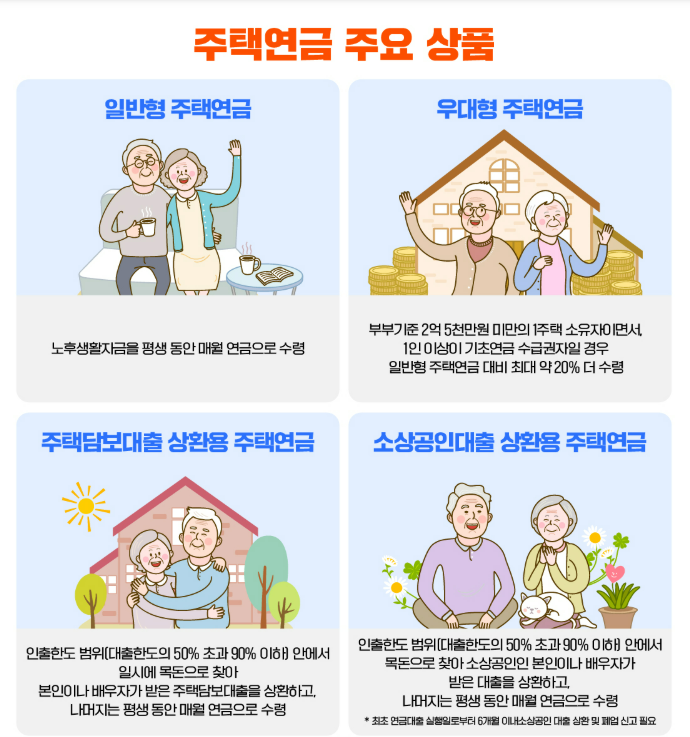| 우대형 주택연금 | 부부 기준 시가 2억 5천만원 미만 1주택 소유자, 1인 이상 기초연금 수급권자 | 일반형 대비 월지급금 최대 약 20% 더 수령, 평생 매월 연금 지급 | 월지급금 인상, 인출한도 확대, 실버타운 이주 시 연금 지속 |