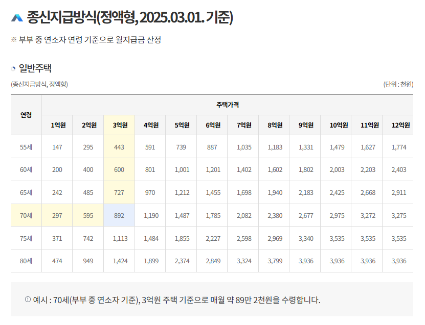 - 특징: 주택을 담보로 매월 연금을 평생 수령. 가입자 사망 시 연금은 배우자에게 동일 금액으로 승계