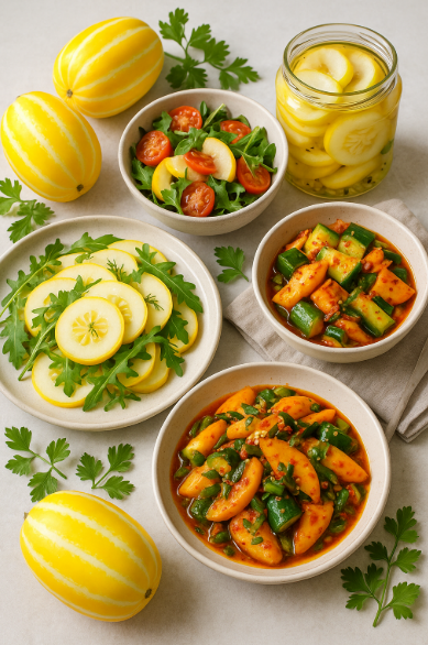 참외, 오이, 방울토마토를 얇게 썰어 소금에 살짝 절인 뒤, 레몬즙·꿀·포도씨유 드레싱과 섞어주면 상큼한 여름 샐러드가 완성돼요. 껍질째 썰어 넣으면 식감도 더 좋답니다.
