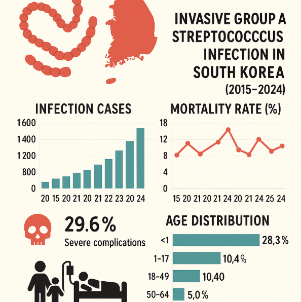 분당서울대병원 연구팀이 질병관리청 의뢰로 2015~2024년 국내 침습성 A군 연쇄상구균 감염 사례를 분석한 결과, 다음과 같은 사실이 드러났습니다.