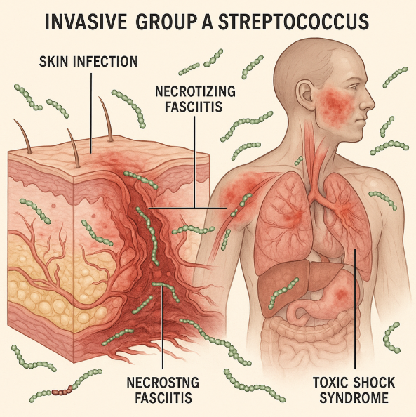 A군 연쇄상구균(Group A Streptococcus, GAS)은 Streptococcus pyogenes라는 세균으로, 주로 목감기(인후염), 피부 감염(농가진) 등 비교적 가벼운 질환을 일으키지만, 드물게 혈액이나 근육, 뇌척수액 등 신체 깊숙한 부위로 침투하면 치명적인 침습성 감염(invasive GAS, iGAS)으로 악화될 수 있습니다.